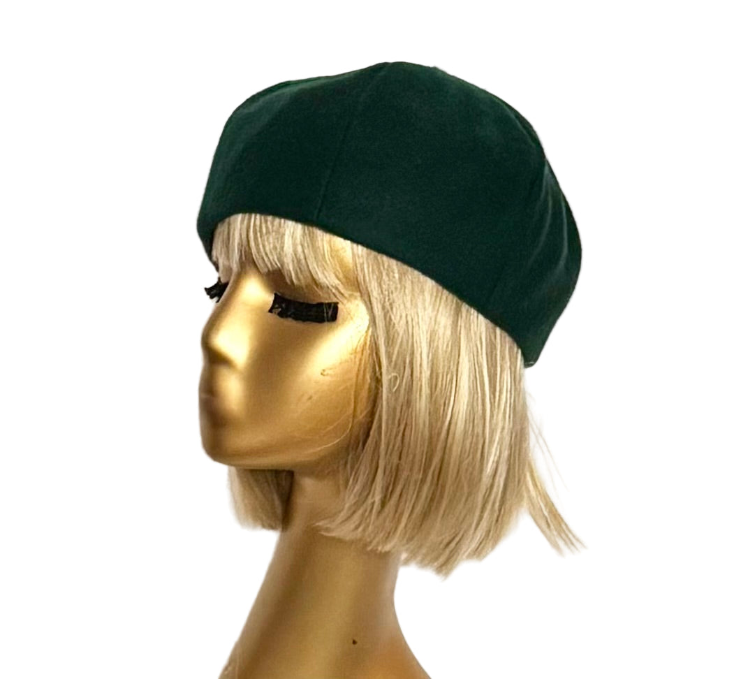 Make a bold statement with this emerald green velvet beret, crafted to turn heads. Lined with smooth silky satin and featuring a plush 1" elastic interior, it delivers both edgy style and comfortable fit. Handmade in the USA, this striking accessory dares you to stand out and own your unique fashion identity.